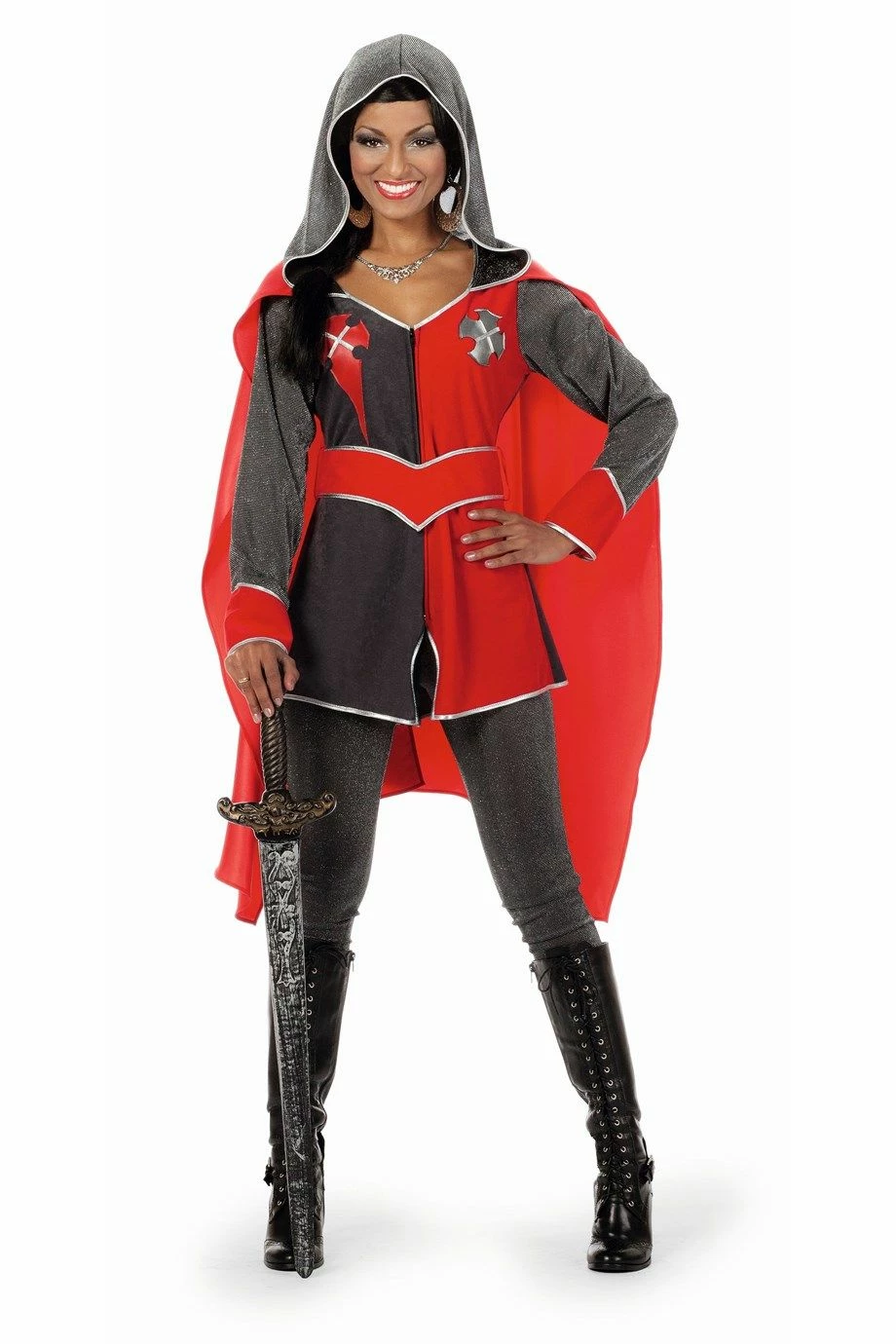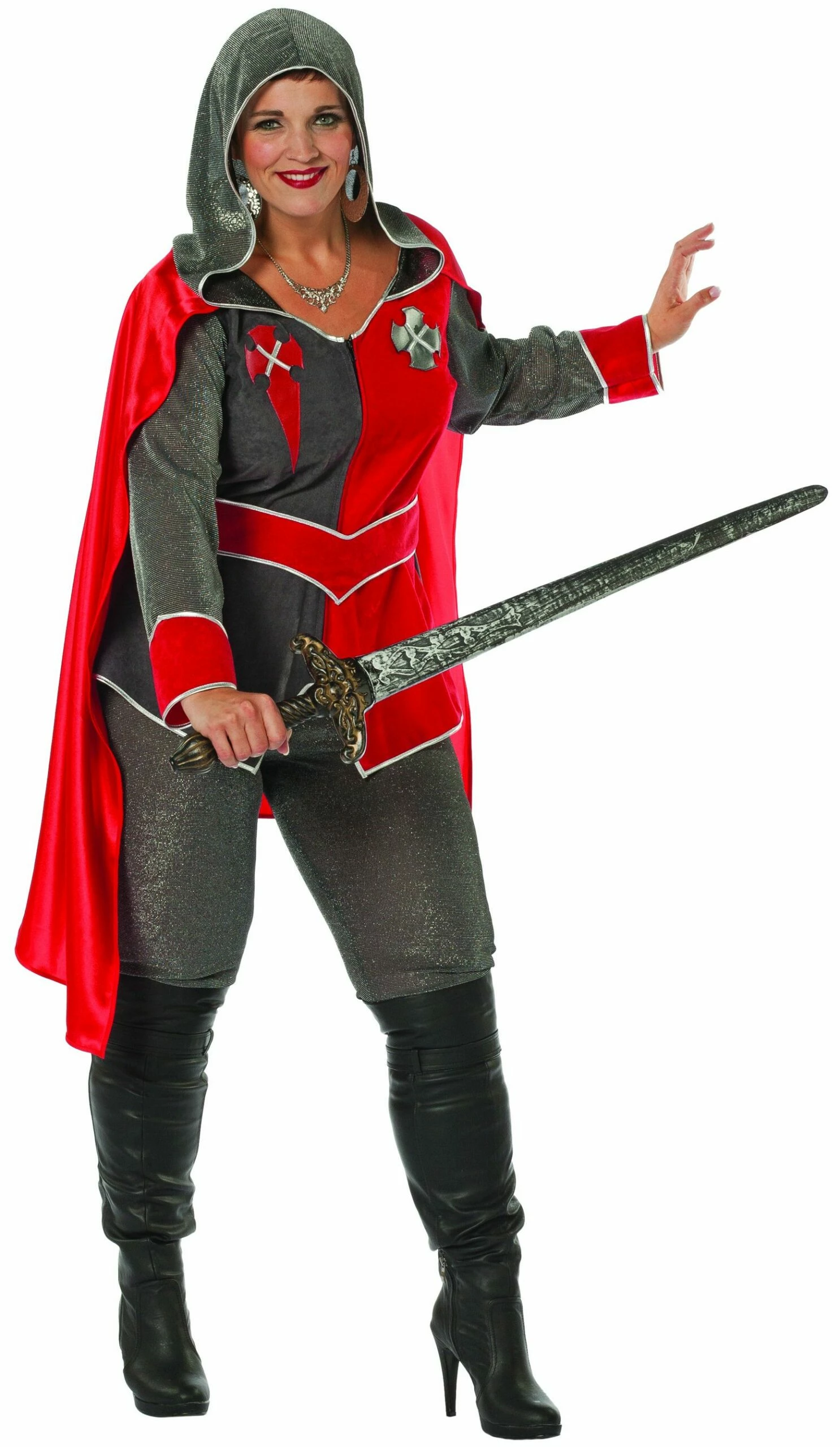 Soepel vallend, rood/grijs ridder jurkje/tuniek met cape.