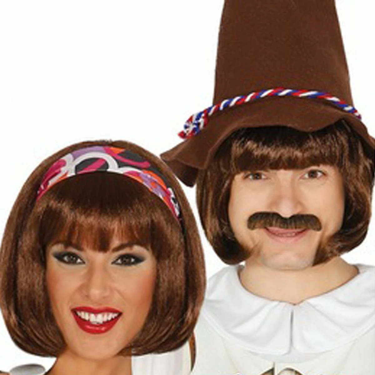 Bruine bobline pruik, exclusief snor, hoed en hoofdbandje.