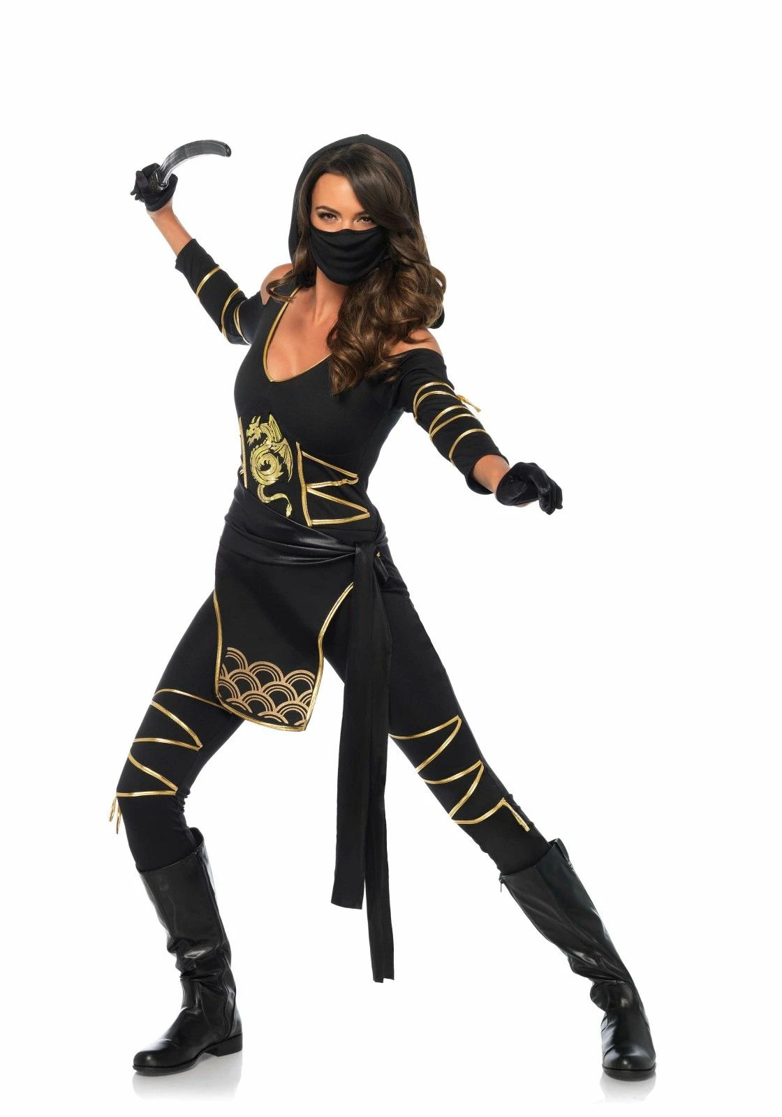 Dit stoere en sexy Stealth Ninja kostuum bestaat uit een cold shoulder catsuit met capuchon, een heupsjaal en gezichtsmasker. Deze ninja catsuit heeft gouden accenten en een print van een gouden draak.