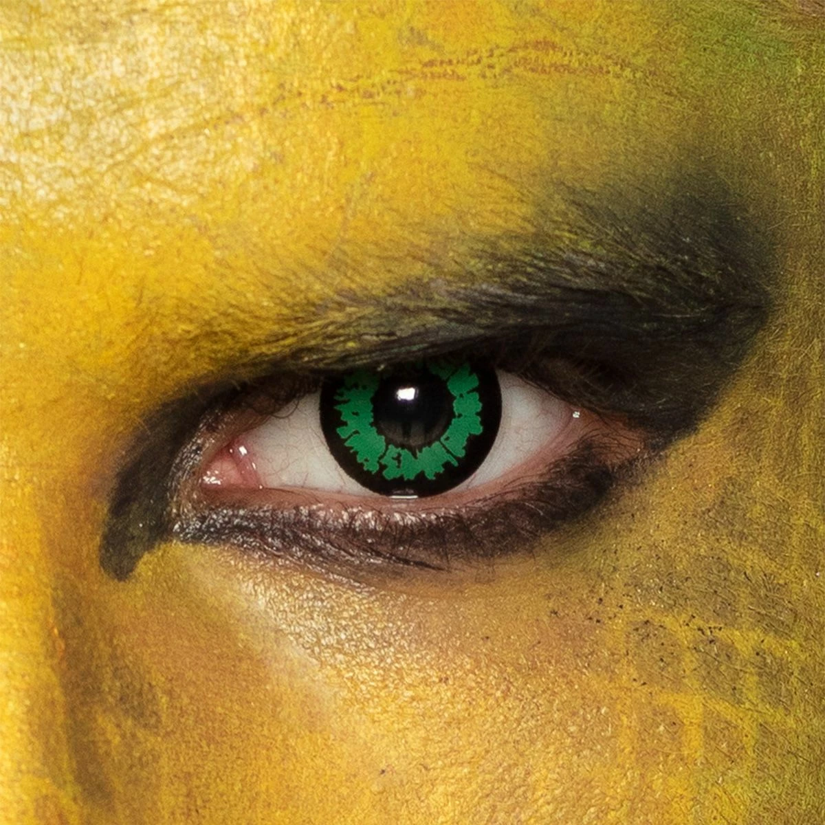 Deze zwarte kleurlenzen met groene binnenkant zijn de finishing touch bij jouw Halloweenkostuum, carnavalsoutfit of je kleding voor een ander themafeestje!